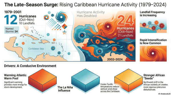 This blog post and the “Deep Dive” podcast, created by NotebookLM, are based on “Recent Increasing Trend in October–November Caribbean Tropical Cyclone Activity” by Klotzbach. (2026). This research analyzes the significant increase in Caribbean tropical cyclone activity during October and November from 1979 to 2024. The authors identify a doubling of hurricane-strength storms and landfalls in recent decades, driven... Continue Reading →