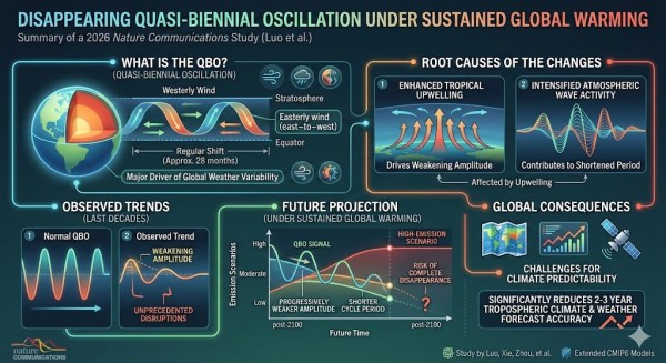 This blog post and the “Deep Dive” podcast, created by NotebookLM, are based on “The disappearing quasi-biennial oscillation under sustained global warming” by Luo et al. (2026). Luo et al. (2026) examines the potential permanent disappearance of the Quasi-Biennial Oscillation (QBO), a major atmospheric cycle, due to prolonged global warming. Using CMIP6 climate models and high-emission scenarios, the study finds that... Continue Reading →