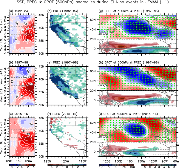 This study newly accepted in Geophysical Research Letters examined why California experienced extremely wet winter and spring conditions during the 1997-98 and 1982-83 El Niños, but near normal rainfall during the extremely strong 2015-16 El Niño. Statistical data analyses and simple model experiments were used to show that sufficiently warm and persistent sea surface temperature anomalies... Continue Reading →