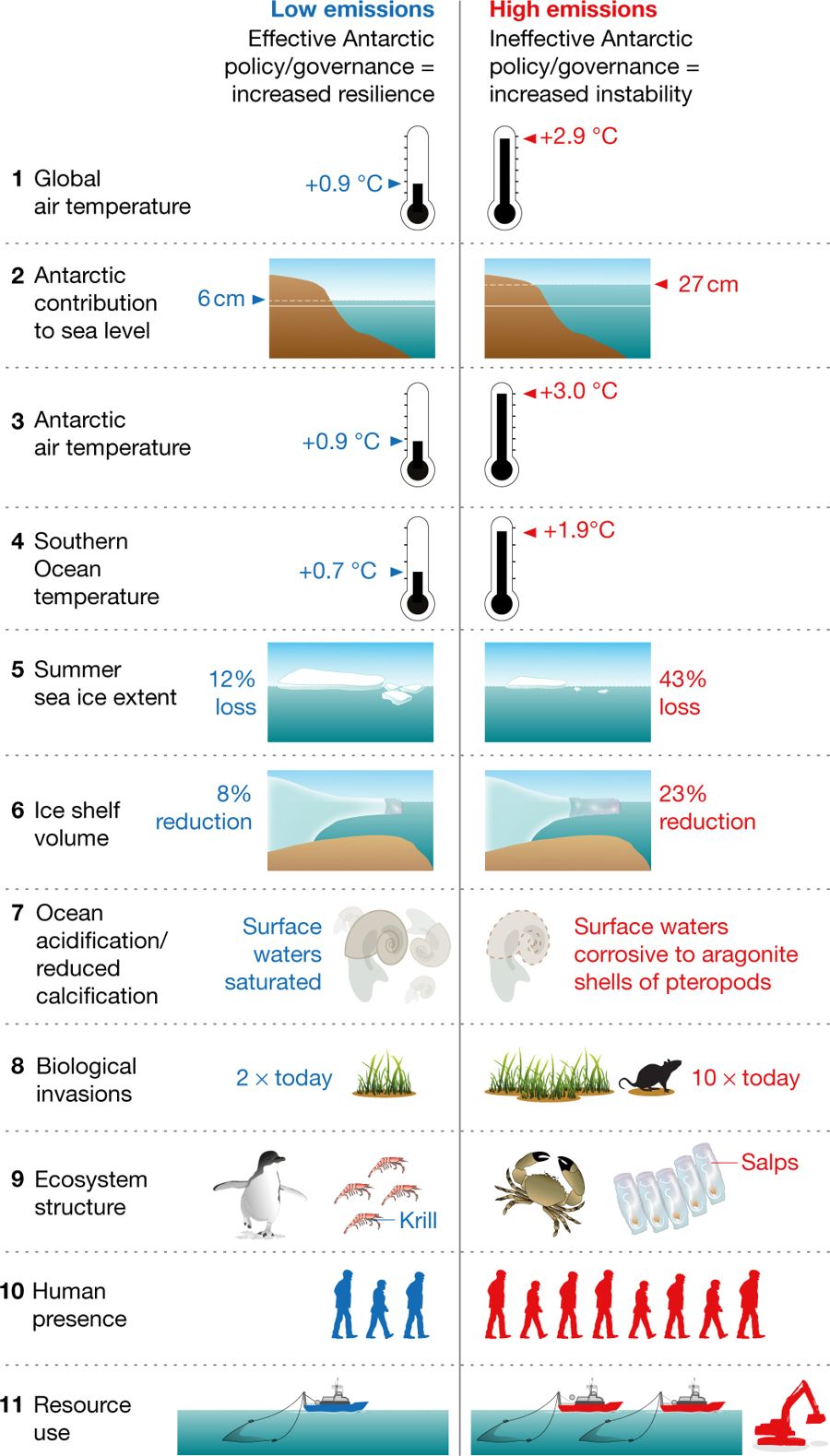 A team of experts in biology, oceanography, glaciology, geophysics, climate science and policy, analyzed the potential impacts of two different future scenarios of carbon emissions, RCP2.6 (low emission & strong action) and RCP 8.5 (high emission & weak action), on Antarctica and the Southern Ocean. The team assessed key systems including global average air temperature; Antarctic contribution to global sea level; Southern Ocean surface temperature; sea ice extent; Antarctic ice shelf volume; and ocean acidification.