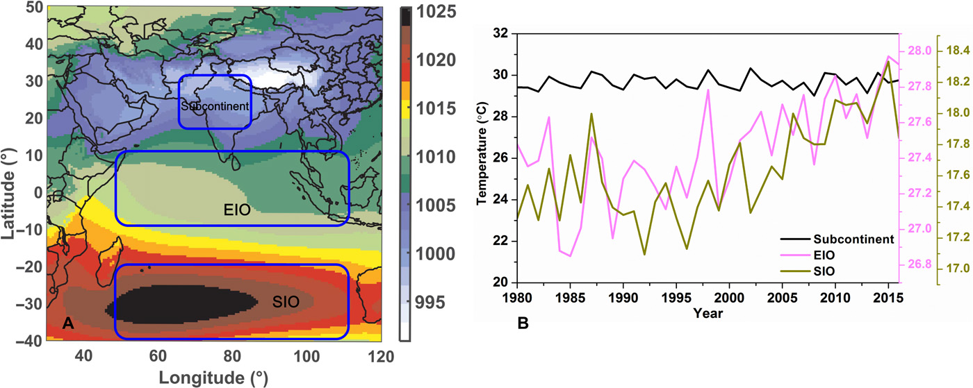Fig. 4 from Gao et al. (2018): Decadal trend of temperature for specific regions. MERRA2–derived spatial distributions of (a) SLP for May-August averaged over the 1980–2016 period and (b) time series of temperature averaged over the Indian subcontinent, EIO, and SIO (regions marked with blue boxes on the left).