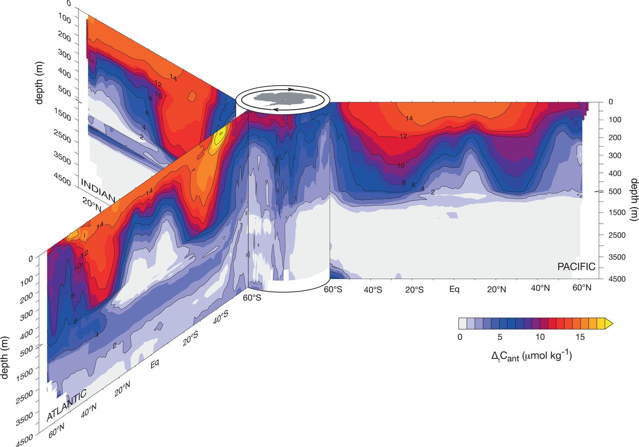 A paper published in Science estimated the oceanic sink of the anthropogenic CO2 (Cant) over the period of 1994 to 2007 by comparing observations collected from global repeated hydrography cruises between 2003 and 2007 to those from the World Ocean Circulation Experiment (WOCE) and Joint Global Ocean Flux Study (JGOFS) program during the 1980s and early 1990s. The study reported a global increase in Cant inventory of 34 ± 4 petagrams of carbon (Pg C) between 1994 and 2007, which represents 31 ± 4% of the global Cant emissions over this period. By reconstructing the map of increase in the oceanic storage of Cant in reference to the expected change given the increasing Cant, the study found substantial regional differences in storage rate due to ocean circulations. Between the basins, the storage in the Pacific (39 ± 4%) and Atlantic (35 ± 4%) has increased by roughly equal amounts, whereas the contribution of the Indian Ocean is smaller (21 ± 10%). In the Atlantic, newly formed North Atlantic Deep Water (NADW) carries the Cant deep into the North Atlantic Ocean then to the South Atlantic below 1500 m. In the Pacific, since there is no deep water formation, Cant is largely trapped in shallow mode and intermediate waters. The Southern Ocean south of 60°S is characterized as a region of low storage rate (about half of the global average) because the upwelling of NADW with low concentrations of Cant prevents a substantial accumulation of Cant there. Additionally, the non-divergent ocean currents (e.g., Ekman transport) in the region carry a massive amount of surface Cant (from the atmosphere) northward into the band of high storage between 50°S and 30°S. Interestingly, the study did not find any evidence of significant Cant sink associated with the Antarctic Bottom Water (AABW) Formation around the Antarctica. This is possibly due to the physical blocking of the air-sea exchange of Cant by Antarctic sea ice and the relatively short residence time of these waters at the surface.
