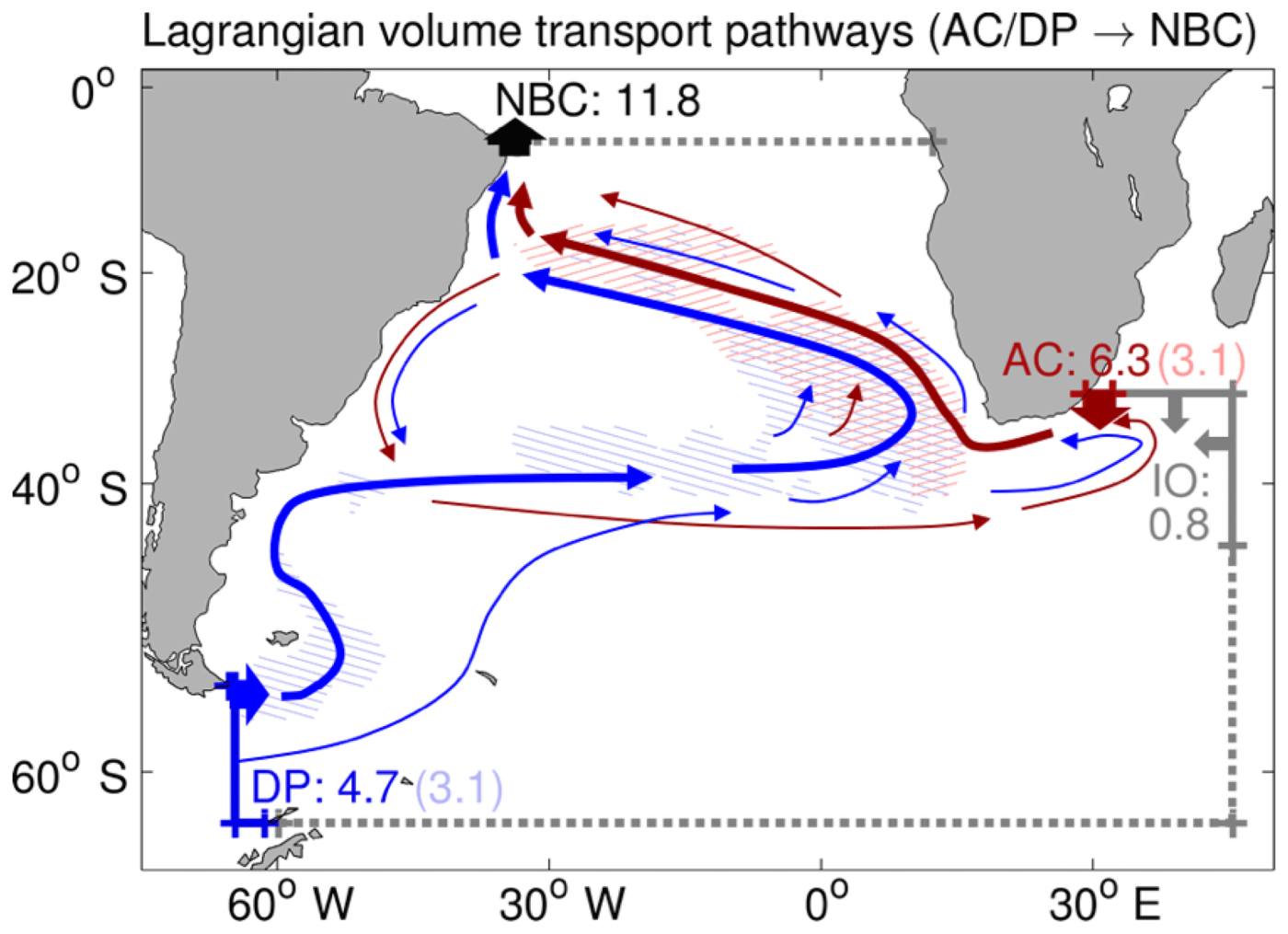 The surface water in the South Atlantic (σ2 < 35.7) is known to originate largely from the Indian Ocean via the Agulhas leakage (e.g., Beal et al., 2011; Gordon, 1986). It is carried northward below the surface mixed layer and brought to the surface via the equatorial Atlantic upwelling. Antarctic Intermediate Water (AAIW) that forms at the surface mixed layer in the southeast Pacific is partly carried to the South Atlantic through the Drake Passage, and serves an important source of the intermediate depth water in the South Atlantic (σ2 = 35.7–36.8; e.g., McCartney, 1977; Talley, 1996). The surface water from the Indian Ocean (warm water route) and the intermediate depth water from the southeast Pacific (cold water route) together feed the upper limb of the Meridional Overturning Circulation (MOC) in the South Atlantic Ocean. According to a data-constrained ocean model study (Lee et al., 2019), the upper limb of the MOC transports 9.1 Sv of the surface water and 7.8 Sv of the intermediate depth water across 30°S. A new study published in Ocean Science used a high-resolution (1/20°) ocean model to better quantify the cold versus warm water routes into the North Brazil Current (NBC), which channels the upper limb of the Atlantic MOC in the tropical South Atlantic. The study used Lagrangian particle trajectories embedded in the ocean model to conclude that out of 11.8 Sv NBC transport across 6°S, about 7.1 Sv (~ 60%) is from the warm route and about 4.7 Sv (~ 40%) is from the cold route. The study also concluded that about 50 ~ 66% of the surface and intermediate depth water reached the surface mixed layer at least once during their transit. This implies that more than half of the water masses supplying the upper limb of the Atlantic MOC are significantly modified through air-sea interactions within the South Atlantic, and thus do not conserve their characteristic properties from the Pacific and Indian Oceans.