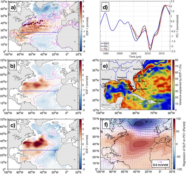 Figure 1 from Volkov et al. (2019): (a-d) The first Empirical Orthogonal Function (EOF1) of the interannual sea level variability (i.e., North Atlantic SSH tripole); (a) EOF1 of SSH explaining 26.7% of the interannual SSH variance; (b) EOF1 of steric sea level (SSL) explaining 47.9% of the interannual SSL variance; (c) EOF1 of thermosteric sea level (TSL) explaining 44.6% of the interannual TSL variance; (d) temporal evolutions (PC1) of EOF1 of (blue) SSH, (black) SSL, and (red) TSL. The approximate location of the RAPID/MOCHA/WBTS observing array is shown by the dotted blueline. (e) Portion of the local interannual SSH variance (%) explained by EOF1; the location of tide gauges used in the analysis is shown by circles. (f) Regression map of (color) SLP on PC1 and (arrows) wind velocity on PC1; the units are Pa per standard deviation of PC1 and m/s per standard deviation of PC1, respectively.