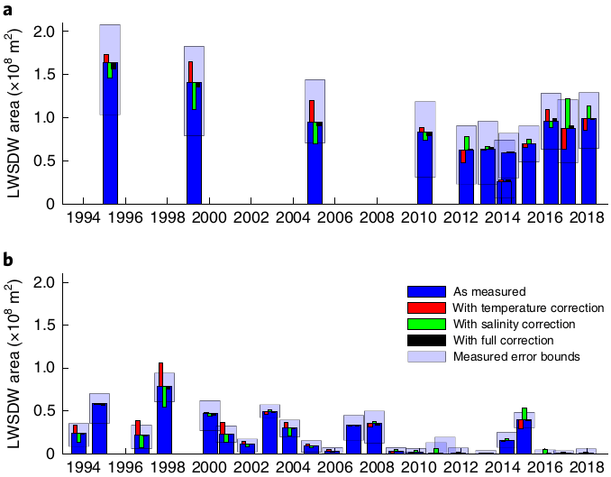 Figure 2 from Abrahamsen et al. (2019): Area of Lower Weddell Sea Deep Water (LWSDW) from hydrographic sections. a,b, Graphs showing LWSDW (γn= 28.31 kg m−3) areas from a section in the eastern Scotia Sea (a) and from the western Scotia Sea section (b). The blue bars are calculated from the measured properties; the red bars are compensated for the temperature anomalies on the γn= 28.31 kg m−3 surface; the green bars are compensated for salinity anomalies; and the black bars are compensated for both temperature and salinity anomalies.
