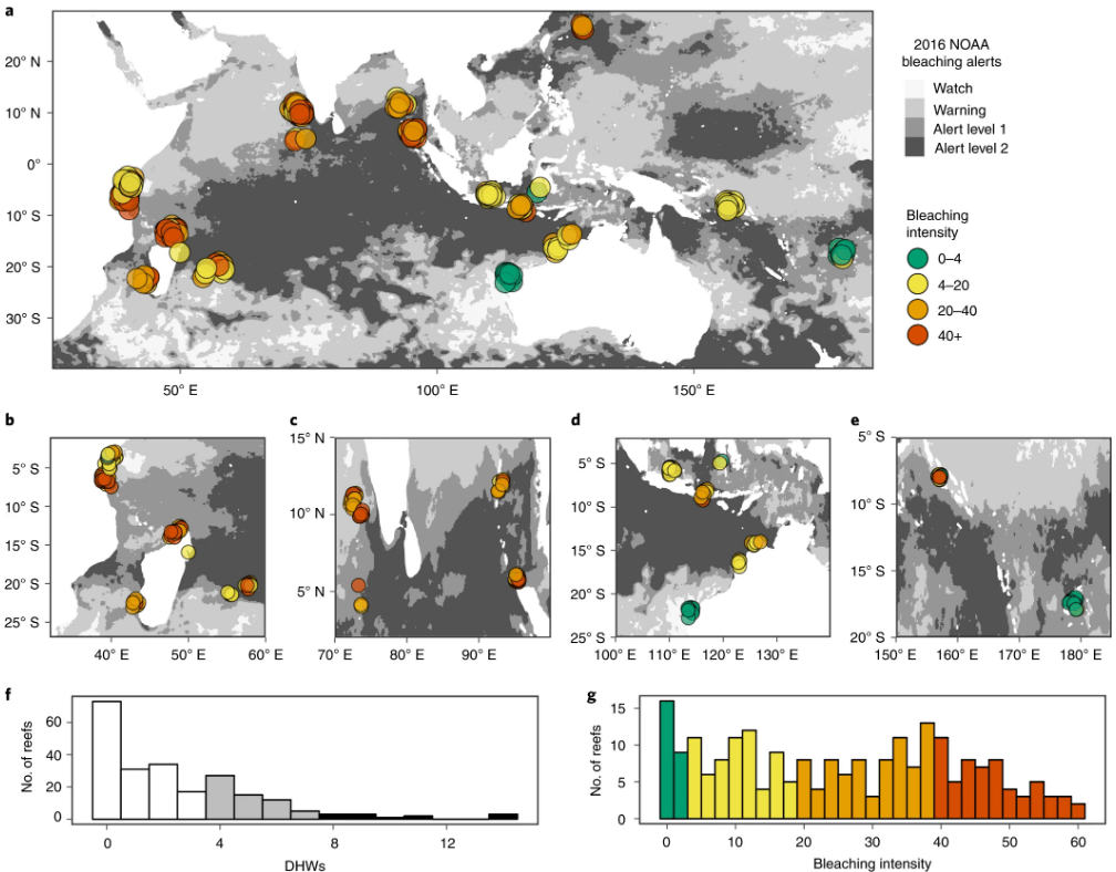 Figure 1 from McClanatha et al. (2019): Indo-Pacific scale and severity of coral bleaching during the 2016 El Niño/Southern Oscillation event: a, The severity of coral bleaching at 226 sites in 12 countries measured from standardized underwater surveys (n = 60,591 coral colonies) during the peak of the warm season. Higher bleaching intensity scores indicate more frequent and severe bleaching. The grey scale indicates the NOAA bleaching alert levels at each site in 2016. b–e, As in a but for Western Indian Ocean (b), Eastern Indian Ocean (c), Australia–Indonesia (d) and eastern Melanesia (e). f, Frequency distribution of 2016 maximum degree-heating weeks (DHWs) in the 90 days before each survey. g, Frequency distribution of bleaching intensity scores for the 226 sites (colour key as in a).