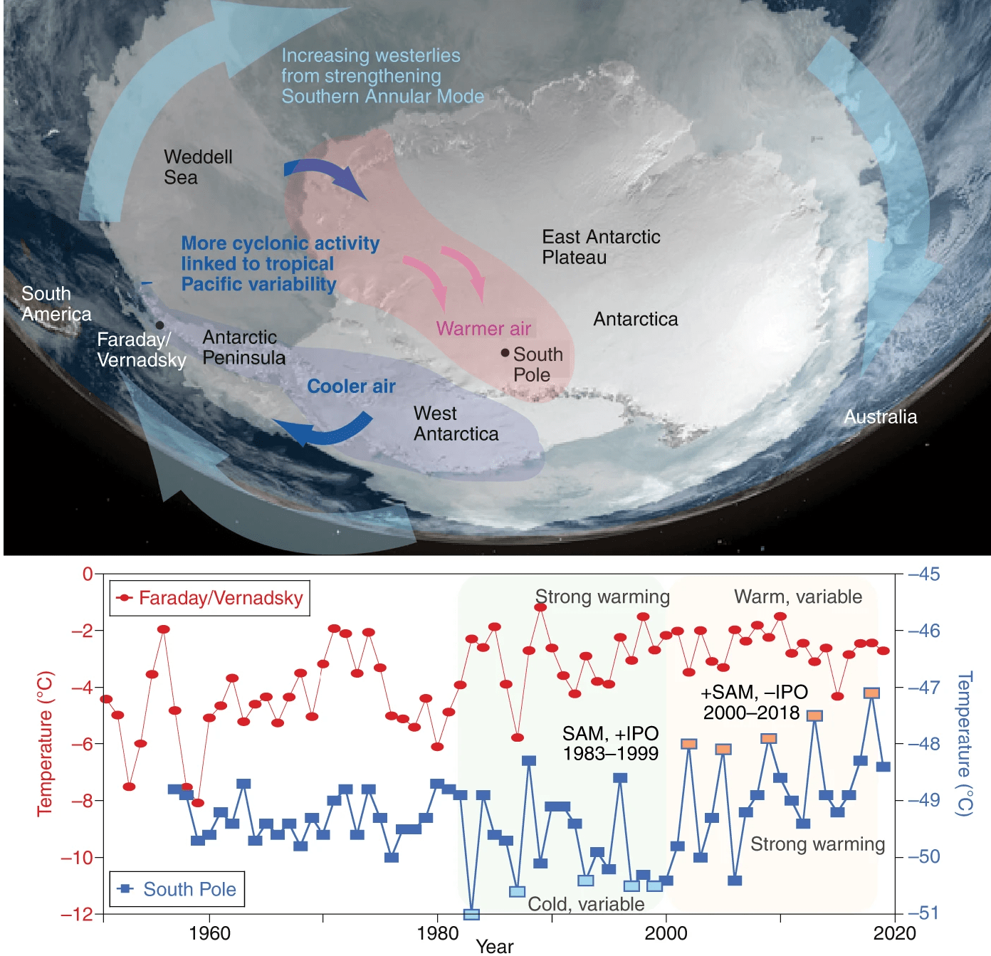 Figure 1 from Stammerjohn and Scambos (2020). Changes in Antarctic atmospheric circulation patterns and air temperature: Antarctica as seen from space with illustration of mechanisms discussed by Clem et al. (2020). Stronger westerlies driven by warming, combined with tropical teleconnections from the negative phase of the Interdecadal Pacific Oscillation, produce enhanced cyclonic activity in the Weddell Sea (dark blue arrows). This increases the advection of warm moist air into the high Antarctic interior (red arrows), but shifts wind direction over the Peninsula, slowing the warming there. Bottom, mean annual air temperatures at Faraday/Vernadsky Station and the South Pole (locations shown in top image). Near-record lows (1983, 1987, 1993, 1997 and 1999) and highs (2002, 2005, 2009, 2013 and 2018) are identified in the South Pole series with blue and red squares, respectively.