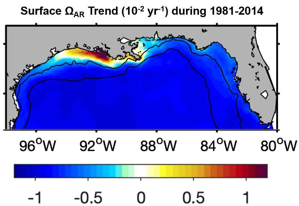 Figure 1c. from Gomez et al., (2021): Surface trends of aragonite saturation state (ΩAR) in the northern GoM during 1981-2014, derived from the model hindcast. Black contour lines depict the 25 and 200 m isobaths. The 25 m isobath defines the limit between the inner and outer shelf. A decline in the saturation state of carbonate minerals, especially aragonite, is a good indicator of a rise in ocean acidification.