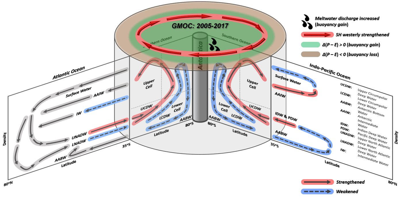 Figure 6 in Lee et al. (2023). A summary schematic of the global MOC in 2005–2017. Major changes in the global MOC and the associated increases in Southern Hemisphere westerly and Antarctic meltwater discharge and P − E changes in 2005−2017 in reference to 1955–1974 are also indicated.