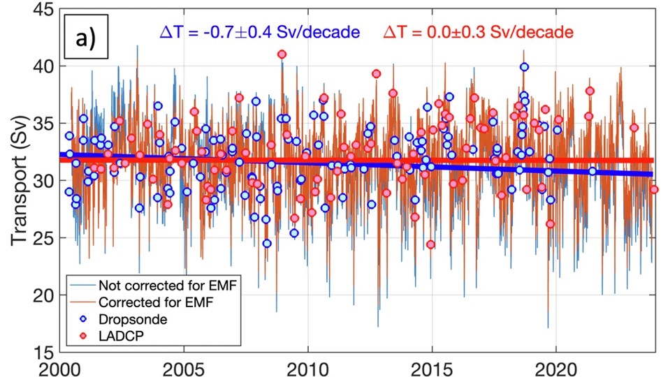 The Florida Current (FC) refers to the Gulf Stream across the Florida Straits between Florida and the Bahamas. Its volume transport has been measured continuously since 1982 using submarine cables across the Florida Straits at 27°N by NOAA’s Atlantic Oceanographic and Meteorological Laboratory (AOML). A previous study (Piecuch and Beal, 2023) reported that the FC volume transport declined significantly by -1.2 ± 1.0 Sv in the past 40 years (since 1982). This statistically significant trend derived from the cable data and other in situ and altimetry data was presented as “the first unequivocal evidence for a recent multidecadal decline in this climate-relevant component of ocean circulation”. In a new study published in Nature Communications, a team of scientists led by sea-going oceanographers at the University of Miami and NOAA’s AOML found that the submarine cable measurement record requires a correction for the secular change in the Earth’s magnetic field. The geomagnetic correction removed a spurious trend, updating the FC transport trend estimate to −0.1 ± 0.2 Sv per decade (during 1982 – 2023), which is statistically insignificant. This study further reevaluated the Atlantic Meridional Overturning Circulation (AMOC) transport across the RAPID AMOC observing array at ~26.5°N given that the FC is a key component of the AMOC. The new estimate reduced the AMOC trend during 2004 – 22 from −1.3 ± 0.7 Sv per decade to −0.8 ± 0.7 Sv per decade, a 40% reduction.