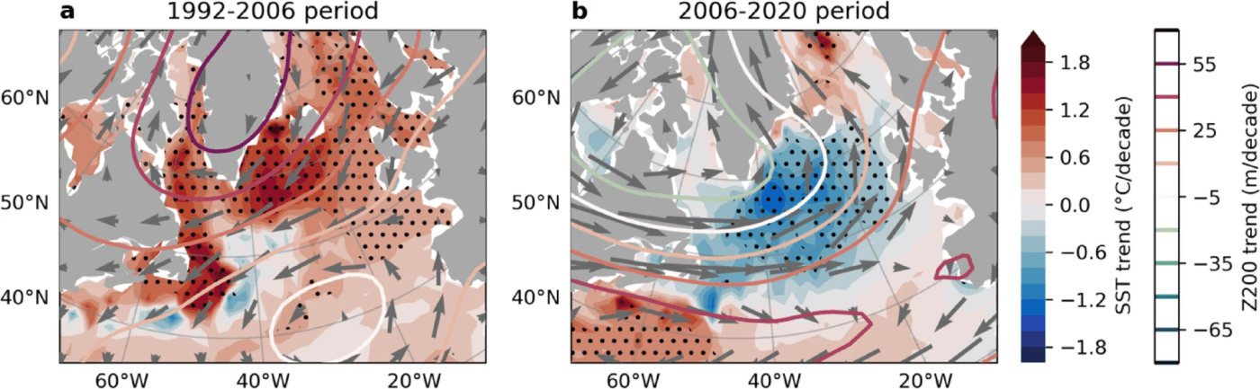 Figure 2 from Li et al. (2025): a–b. Linear trend of annual ORAS5 SST (shading), ERA5 200 hPa geopotential height (Z200, contours), and 200 hPa horizontal winds (arrows) for the period 1992–2006 in a, and for the period 2006–2020 in b. Black stippling in all plots indicates statistically significant trends at the 95% confidence level.