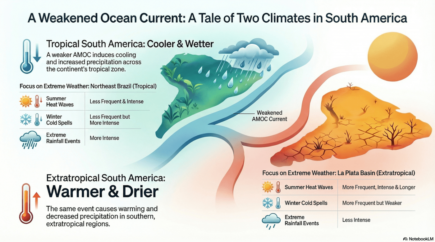 The most startling finding from the research is that a weakening AMOC creates a dramatic split in South America’s climate. The model shows that a slowdown induces cooling and increased rainfall in the tropical northern parts of the continent. At the same time, it causes warming and drier conditions in the extratropical southern regions (the areas outside of the tropics, including much of Argentina, Uruguay, and Southern Brazil).