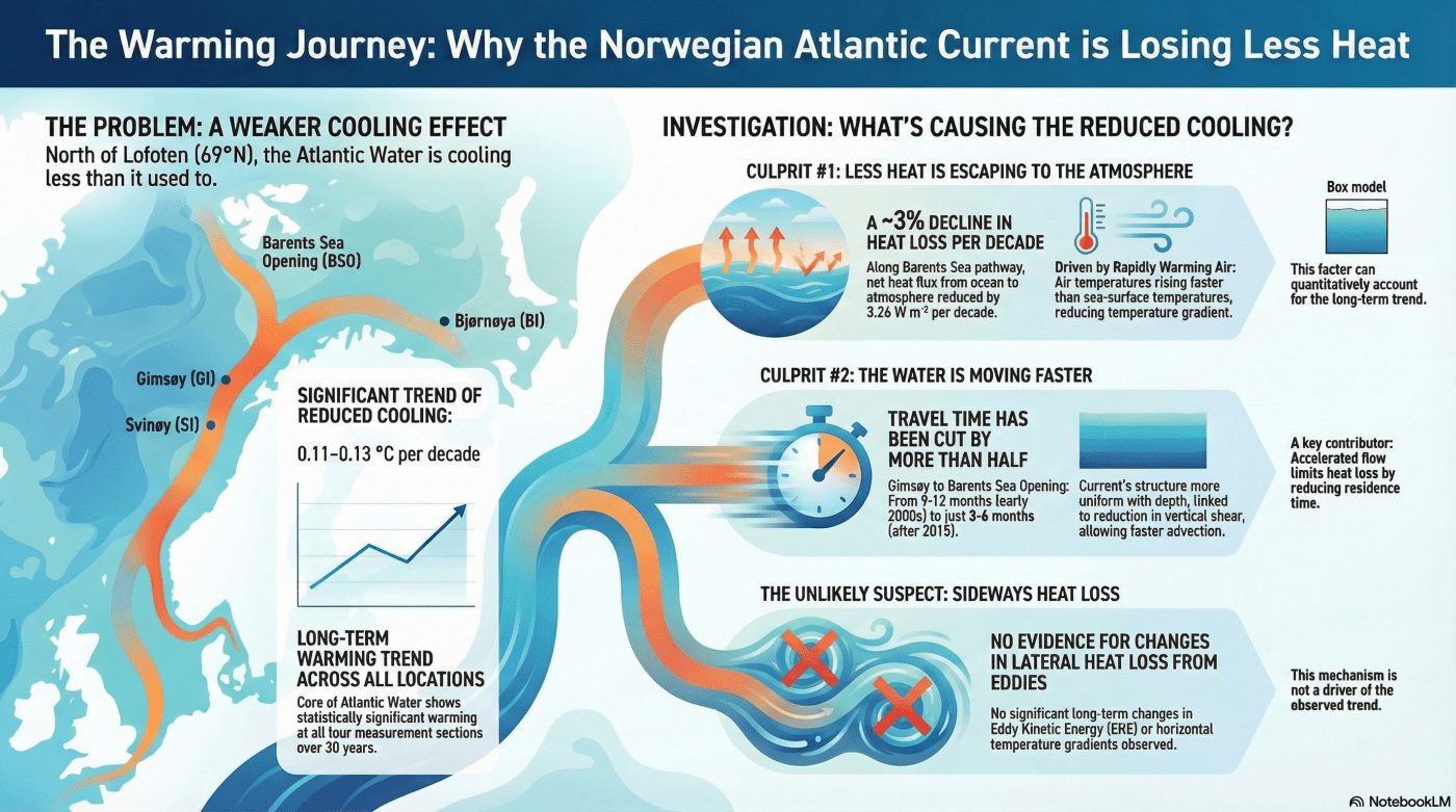 The 30-year record reveals a complex and dynamic shift in a fundamental climate process. The Norwegian Atlantic Current is losing its ability to cool efficiently, but the cause isn’t a single, simple fault. Instead, it is a dynamic interplay between two powerful forces: the “warm blanket” of the atmosphere and the “faster highway” of the current itself. The researchers also investigated other potential causes, such as changes in ocean eddies that mix heat laterally, but found no evidence that they were responsible for the observed trend.
