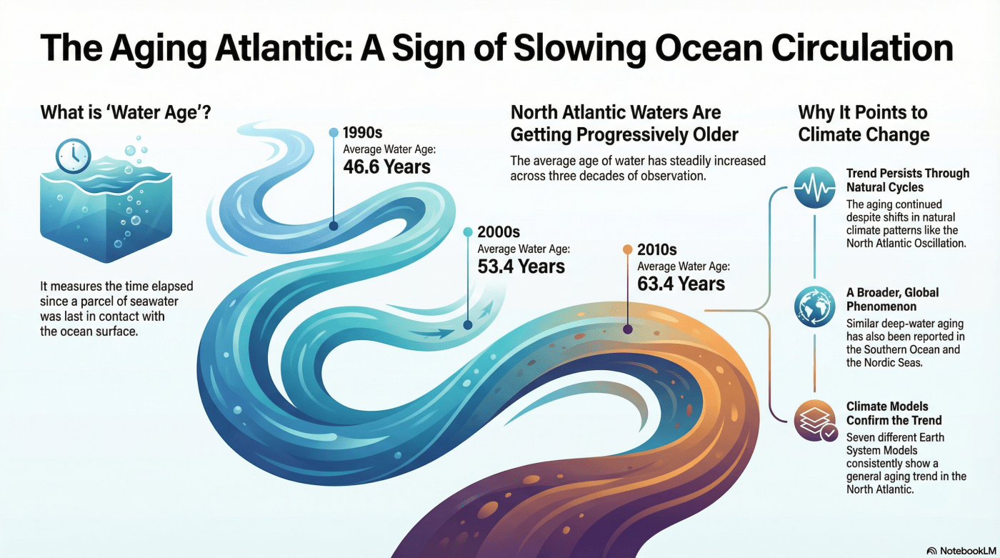 A new study suggests that seawater in the North Atlantic is aging, a phenomenon that indicates a slowdown in ocean ventilation over the last thirty years. By measuring the concentrations of chemical tracers like CFC-12 and sulfur hexafluoride, the study determined how long water has been isolated from the surface. While regional areas like the Labrador Sea show significant natural variability due to natural weather and climate variability , the broader basin exhibits a persistent aging trend and rising oxygen utilization. The study integrated these real-world observations with seven different climate models, all of which point to a human-driven climate change signal rather than mere natural fluctuation. These findings are critical because a weakening ventilation system reduces the ocean’s ability to sequester carbon and heat, potentially accelerating global warming. Future projections under high-emission scenarios further suggest that this deep-ocean aging will intensify, threatening marine ecosystems through prolonged deoxygenation.