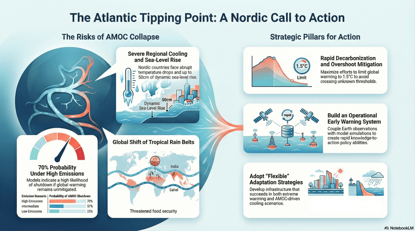 The collapse of the AMOC would reshape the geopolitical map, straining NATO security, disrupting the Northern Sea Route, and fueling Arctic resource competition. We are moving from an era of “managing change” to an era of “surviving transformation.”