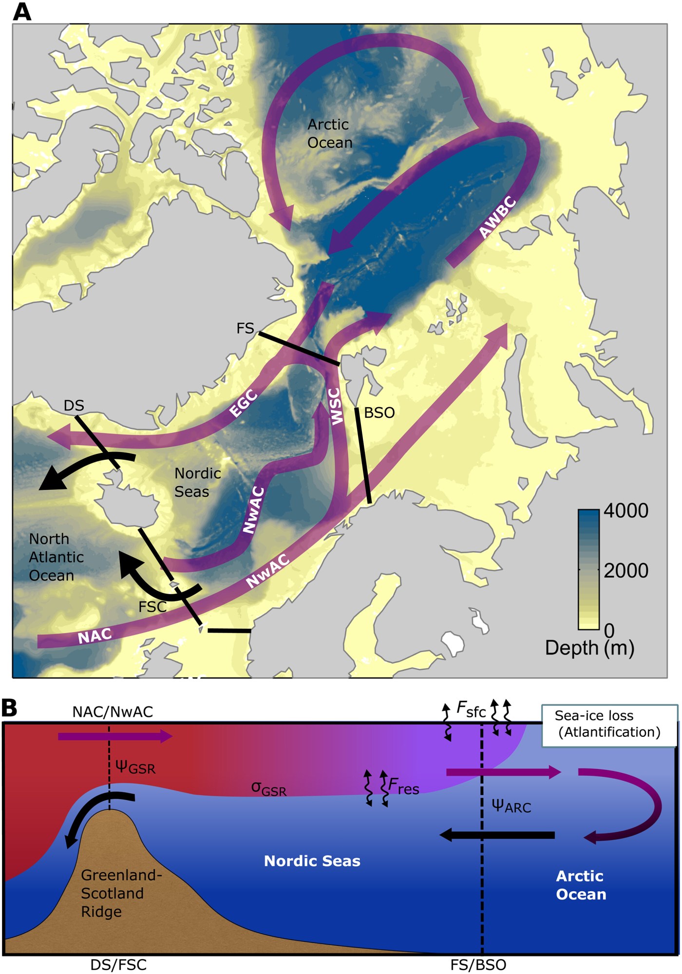 Figure 1 from Årthun et al. (2025): The overturning circulation in the Nordic Seas and Arctic Ocean. (A) Horizontal view of the ocean circulation in the Nordic Seas and Arctic Ocean. Warm Atlantic Water (AW) is transported northward by the North Atlantic Current (NAC), Norwegian Atlantic Current (NwAC), and West Spitsbergen Current (WSC). The AW enters the Arctic Ocean through the Barents Sea Opening (BSO) and Fram Strait (FS) and flows along the Atlantic Water Boundary Current (AWBC), before returning southward in the East Greenland Current (EGC). Cold, dense overflows (black arrows) exit the Nordic Seas through Denmark Strait (DS) and Faroe-Shetland Channel (FSC). The background color shows bottom depth in GLORYS12. (B) Vertical view of the overturning circulation in the Nordic Seas and Arctic Ocean. The terms used in the isopycnal volume budget used to quantify overturning changes are included.