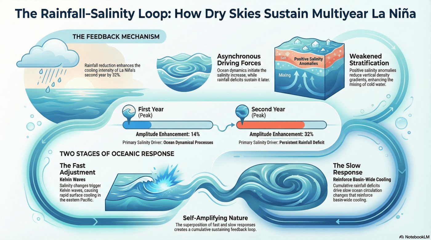 This research investigates how rainfall-induced salinity changes act as a critical feedback loop to sustain multiyear La Niña events. While early stages of these cooling events are driven by ocean dynamics like advection, the study reveals that persistent rainfall deficits in the western-central Pacific lead to higher surface salinity. These positive salinity anomalies weaken upper-ocean stratification, allowing colder subsurface water to mix upward and reinforce surface cooling. Quantitative models show that this rainfall–salinity feedback amplifies La Niña’s intensity by 14% in the first year and 32% in the second. By integrating rapid equatorial waves and slower circulation adjustments, the authors demonstrate that cumulative rainfall anomalies are essential for preventing the tropical Pacific from returning to a neutral state. These findings offer a new mechanical framework for improving climate predictability regarding prolonged environmental shifts.