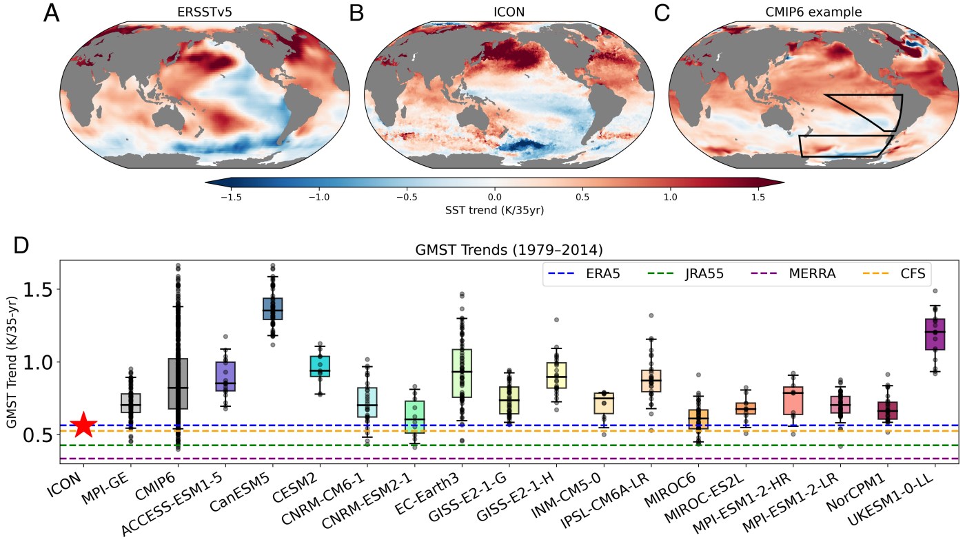 Figure 1 from Kang et al. (2026): Comparison of surface temperature trends over 1979 to 2014 in observations, ICON, and CMIP6 ensemble. Spatial maps of SST trend based on (A) ERSSTv5 observations (33), (B) ICON historical simulation, (C) one of the CMIP6 realizations close to CMIP6 multi-model mean. (D) Box-whisker plot of global mean surface temperature (GMST) trends for 100-member MPI-ESM Grand Ensemble (MPI-GE), all available CMIP6, and subgroups of CMIP6 ensembles that have 10 members or more of their particular model. Solid black line within each box mark 50% percentile, edges of the box represent 25% and 75% percentile, and whiskers mark 5% and 95% percentile. Gray circles represent individual ensemble members. The GMST trend from ICON (indicated by the red star and red solid line) can be compared with multiple observational products, as shown in the legend.