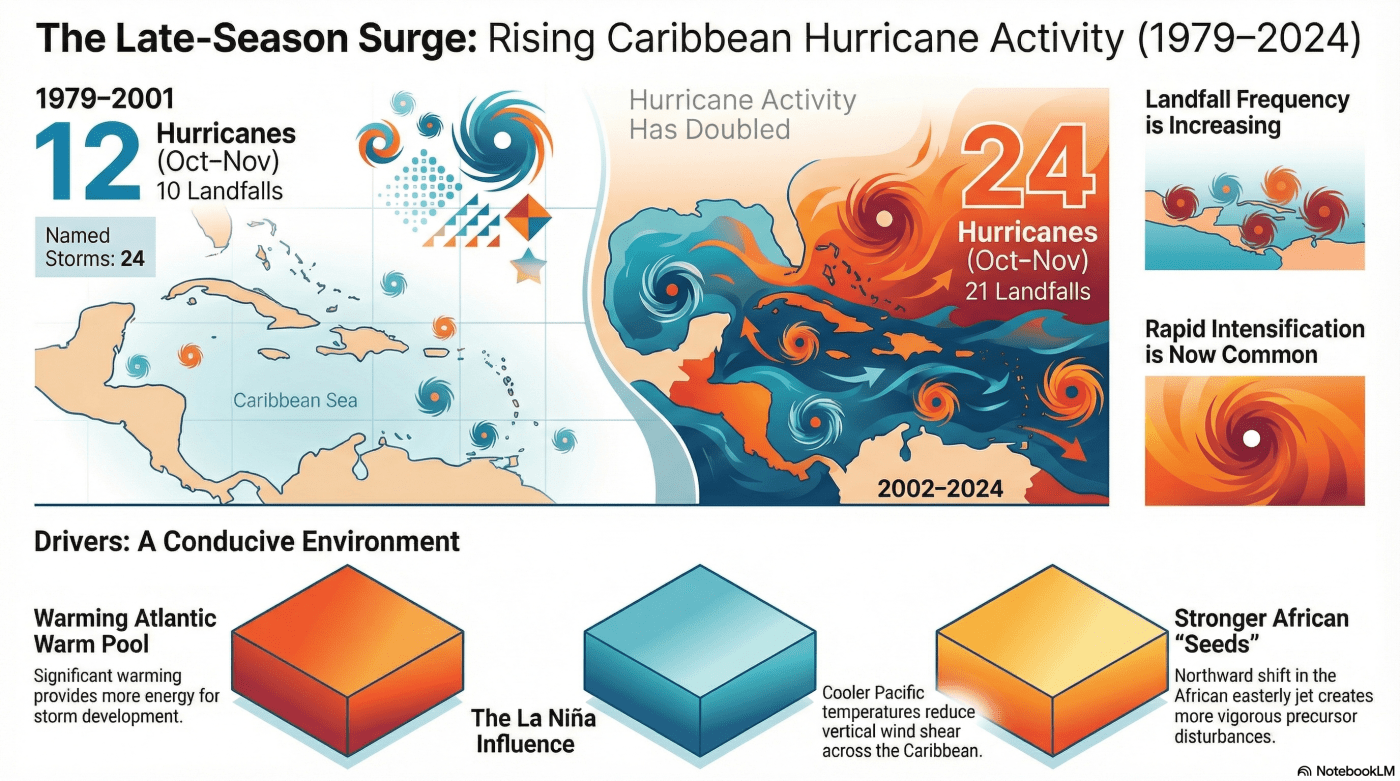 This research analyzes the significant increase in Caribbean tropical cyclone activity during October and November from 1979 to 2024. The authors identify a doubling of hurricane-strength storms and landfalls in recent decades, driven by a warming Atlantic Warm Pool and a shift toward La Niña-like conditions in the Pacific. These shifting ocean patterns have created a more favorable environment for storm development by reducing vertical wind shear and increasing mid-level moisture. Additionally, changes in the African easterly jet have provided stronger atmospheric “seeds” that foster storm genesis late in the season. The study concludes that as long as the Caribbean continues to warm faster than the tropical Pacific, heightened late-season hurricane activity is likely to persist. These trends pose a growing threat to the Caribbean islands, Central America, and the United States, where such storms have recently caused massive economic damage and fatalities.