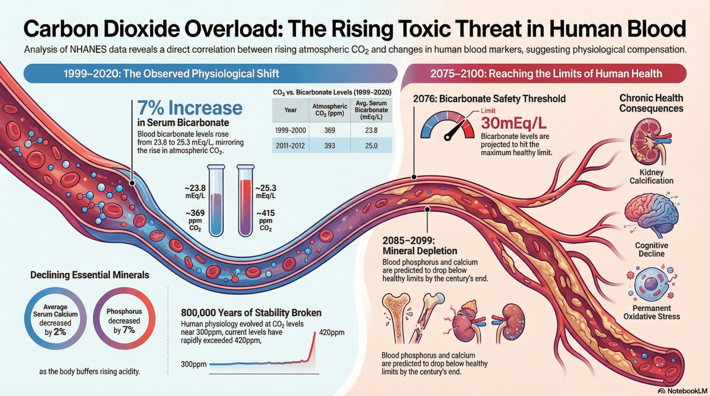 Evidence from the U.S. National Health and Nutrition Examination Survey (NHANES) reveals a startling shift: serum bicarbonate (HCO3−) levels in the American population climbed by roughly 7% between 1999 and 2020. This trend tracks the rise of atmospheric CO2 with haunting precision. Bicarbonate is the body’s primary buffer against acidity, and its surge indicates that our systems are working overtime to neutralize the extra CO2 we inhale with every breath.