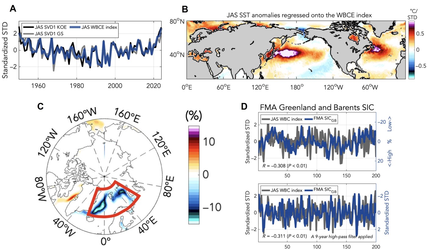 Figure derived from Figures 1 & 4 in Joh et al. (2026): (A-B) Western Boundary Current Extension (WBCE) temperature variability as an indicator of summer midlatitude climate. (A) Standardized SVD1 time series (black for Kuroshio-Oyashio Extension (KOE) and gray for Gulf Stream (GS)) and the WBCE index (blue), which is defined as the mean of those paired time series. Standardized STD on the y-axis denotes that the time series have been standardized by their respective standard deviations (STDS). (B) Pattern of the SVD1 computed as the regression coefficients of July-September (JAS) SST (°c) anomalies on the WBCE index. As in panel (A), standardized STD indicates normalization by the standard deviation. Both panels are derived from the ERA5 reanalysis dataset between 1950 and 2024. (C-D). Dynamical impacts of preceding winter Greenland and Barents SIC on midlatitudes in 1990CTRL. (A) Regression coefficients of February-April (FMA) SIC anomalies onto the JAS WBCE index. (B) Comparisons of the raw (top) and 9-year high-pass–filtered (bottom) JAS WBCE index (gray) and FMA regional-mean SIC (blue) over the Greenland and Barents Sea region (67° to 82°N, 20°W to 65°E), indicated with a red box in (A). Note that the y axis of SIC is reversed.