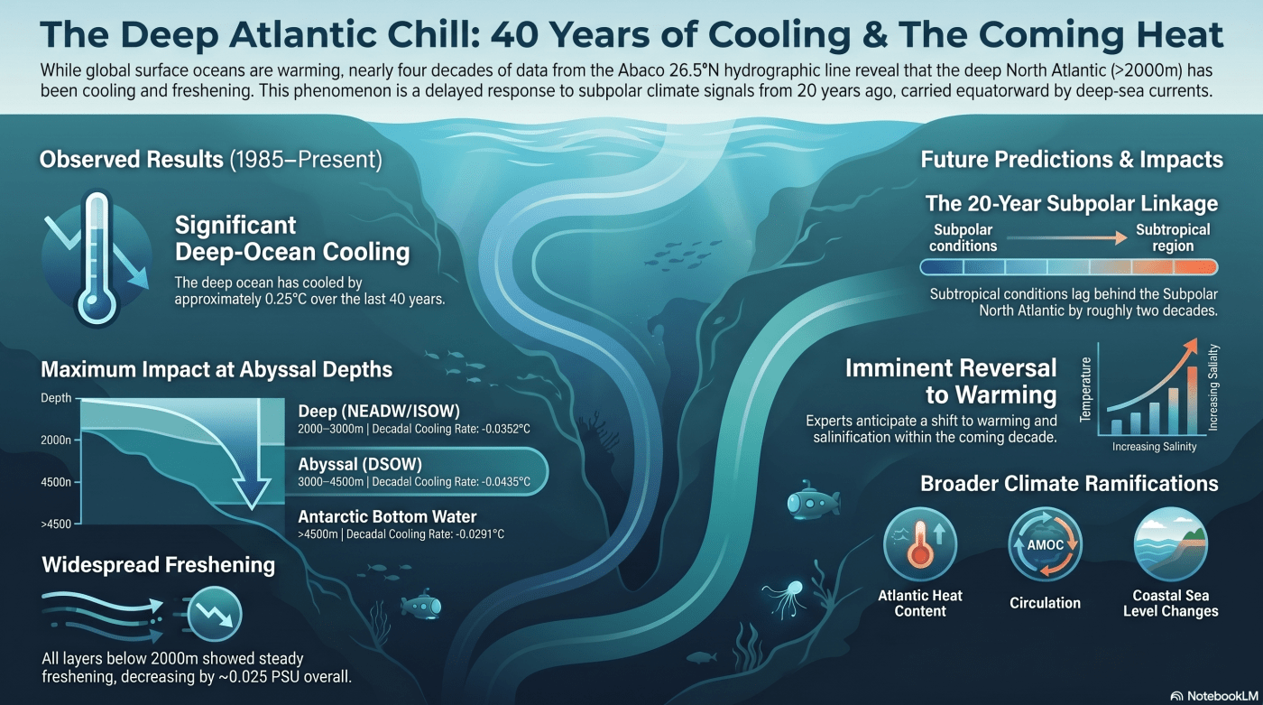 Chomiak et al. (2025) identifies a surprising cooling and freshening trend in the deep waters of the Subtropical North Atlantic, specifically at the 26.5°N latitude off the Bahamas. While much of the global ocean is warming due to climate change, data from the last forty years reveal that these deeper layers are currently reflecting historical subpolar conditions. Scientists have traced these changes back to environmental shifts in the Labrador Sea and surrounding northern basins that occurred over two decades ago. The study utilizes long-term hydrographic surveys, moorings, and seafloor sensors to connect the movement of deep water masses to atmospheric patterns like the North Atlantic Oscillation. Despite the recent cooling, the authors anticipate a shift toward warming and increased salinity in the near future as more recent northern signals arrive. These findings are critical for understanding how large-scale ocean circulation influences global heat distribution and rising sea levels.
