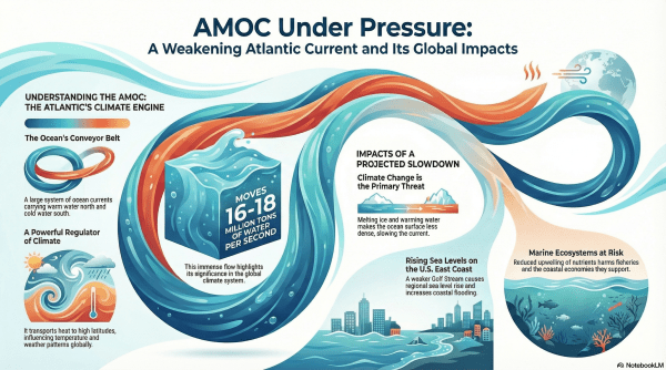 This blog post and the “Deep Dive” podcast, created by NotebookLM, are based on "State of the Science Fact Sheet: Atlantic Meridional Overturning Circulation (AMOC)" by NOAA Science Council. This NOAA fact sheet briefly explains the Atlantic Meridional Overturning Circulation (AMOC), defining it as a critical ocean current that transports heat, salt, and carbon by... Continue Reading →
